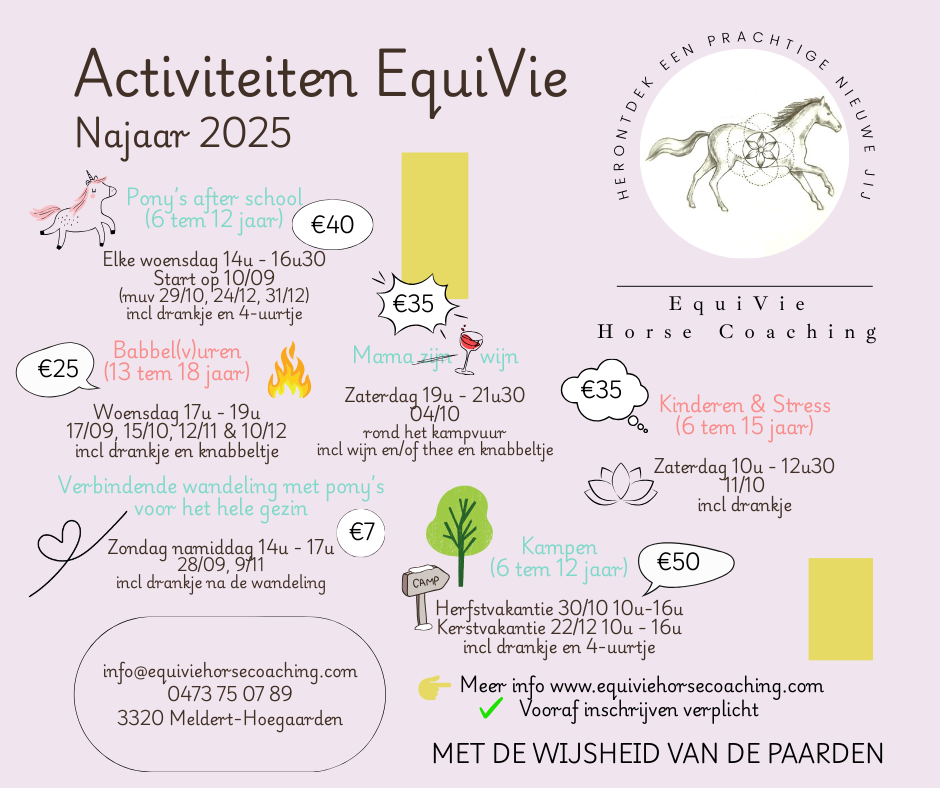 - Ponykampen: 3-daagse en 1-daagse kampen vol thema’s rond samenwerking, veerkracht en plezier (meer info via deze link).